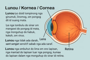 Kornea ialah lapisan luar mata yang berbentuk kubah dan jernih, terletak di bahagian hadapan mata. Ia berfungsi seperti tingkap pelindung, menghalang habuk, kuman dan zarah berbahaya daripada memasuki mata, sambil memainkan peranan penting dalam memfokuskan cahaya ke retina bagi menghasilkan penglihatan yang jelas.